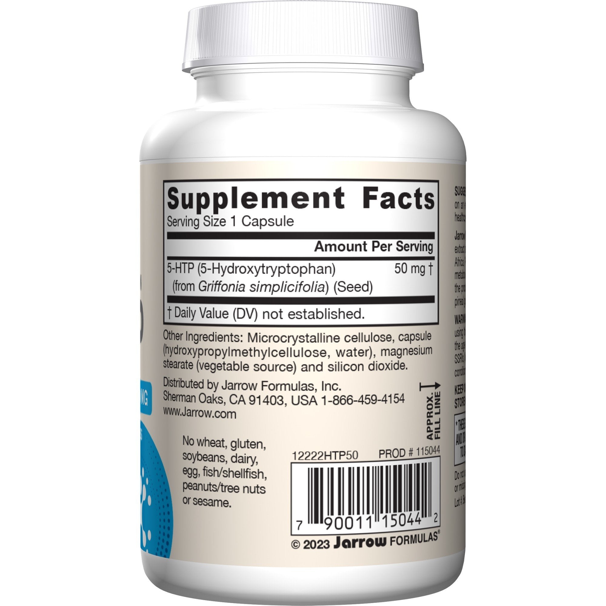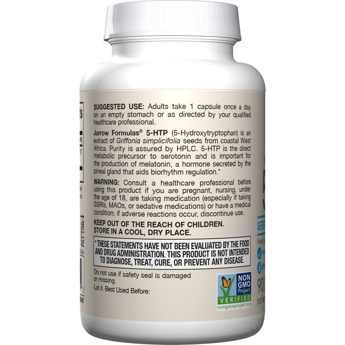 Jarrow Formulas 5-HTP 5-Hydroxytryptophan) is an extract of Griffonia simplicifolia seeds from coastal West Africa. Purity is assured by HPLC. 5-HTP is the direct metabolic precursor to serotonin and is important for the production of melatonin, a hormone secreted by the pineal gland that aids biorhythm regulation.