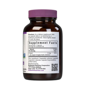 Bluebonnets Albion Chelated Copper Capsules provide 3 mg of elemental copper from fully reacted copper bisglycinate, an amino acid chelate mineral from Albion.Copper is anessential element that is necessary for nervous system and immune health.