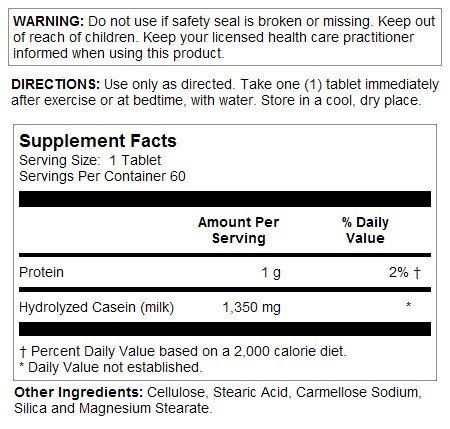 | Peptides (from Casein Hydrolysate Milk Protein) L-Glutamic Acid, L-Proline, L-Leucine, L-Aspartic Acid, L-Lysine, L-Valine, L-Isoleucine, L-Serine, L-Phenylalanine, L-Tyrosine, L-Threonine, L-Alanine, L-Methionine, L-Histidine, Glycine, L-Arginine, L-Tryptophan and L-Cystine | 2 g | |