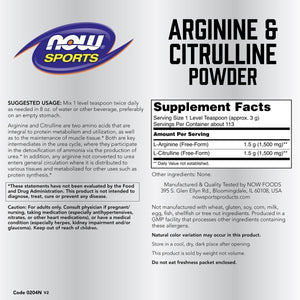 The amino acids arginine and citrulline play an integral role in the bodys metabolism and utilization of protein and are essential for the maintenance of muscle tissue.* Arginine is a precursor to nitric oxide (NO), which promotes increased circulation by relaxing blood vessels.* Citrulline is necessary for the elimination of ammonia, a toxic by-product of exertion, thereby supporting the bodys natural recovery processes after exercise.* In addition, excess citrulline is converted to arginine, helping to sustain arginine and NO levels better than arginine alone.