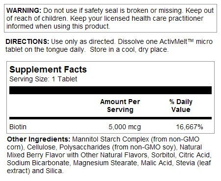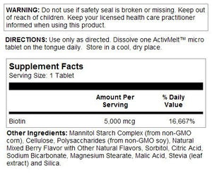 Kal Biotin ActivMelt natural berry flavored micro tablets melt quickly in the mouth and are designed for optimal absorption in the body.Vegetarian.Innovative Quality Since 1932Dietary Supplement1 Daily ActivMelt Instant Dissolve Mixed Berry Natural Flavor