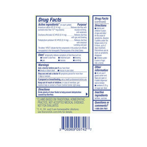 Arsenicum album 9C HPUS (contains less than 10-18 mg arsenic) 0.14 mg (Relieves diarrhea with nausea, vomiting, and weakness), Cinchona officinalis 5C HPUS 0.14 mg (Relieves diarrhea with gas and bloating), Podophyllum peltatum 9C HPUS 0.14 mg (Relieves diarrhea with intestinal rumbling and pain)