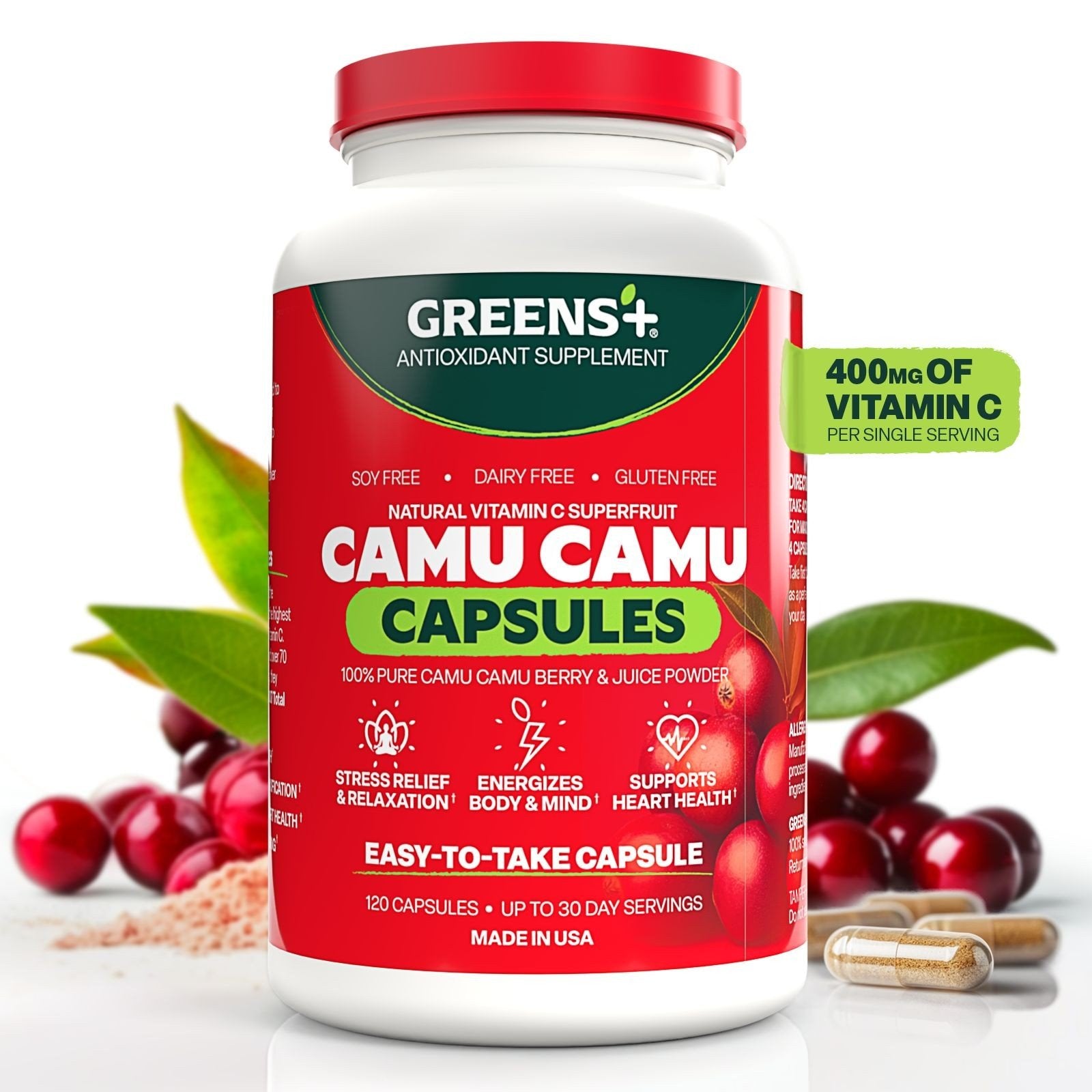 Greens Plus Camu Camu Capsules contain 100% pure camu berry fruit and juice powder from the Amazon. Camu Camu has the highest concentration of natural Vitamin C. Camu Camu contains 15% Ascorbic Acid. Ascorbic Acid is considered, by nutrition scientists, to be the single most important vitamin required for human health. Almost all organisms can synthesize their own Vitamin C from glucose.