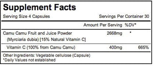 These synergistic phytonutrients combine to deliver a massive 110,807 Total ORAC units per serving. One 4 capsule serving of Camu Camu Caps provides 400mg of 100% natural Vitamin C, the daily amount recommended for healthy adults by the Linus Pauling Institute (LPI). LPI estimates that 5 servings of fresh fruits and vegetables provides approximately 200mg of Vitamin C, therefore 1 serving of Camu Camu Caps provides the same amount of Vitamin C as 10 servings fruits and vegetables.