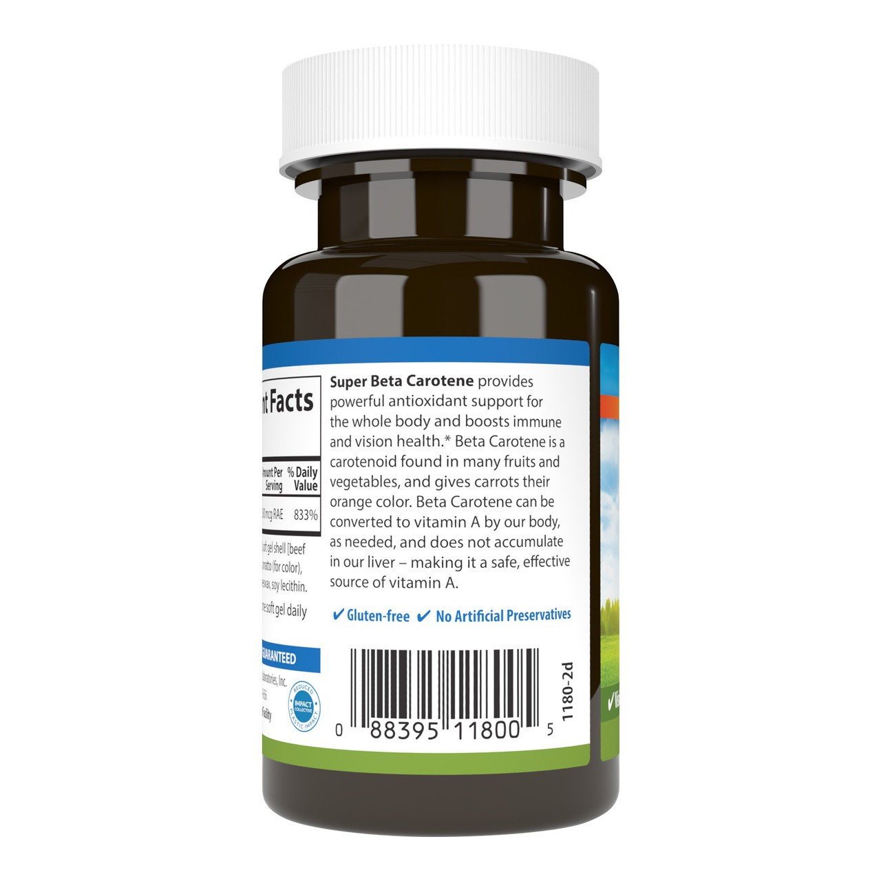 Beta carotene is an important antioxidant in the body that also acts as a source of vitamin A. As a precursor to vitamin A, beta carotene is only converted as needed, making it a safe vitamin A source in higher doses. Carlson Super Beta Carotene contains 100% natural beta carotene and no synthetic beta carotene. Natural beta carotene has been shown to be more bioavailable and bioactive than synthetic beta carotene in the human body.