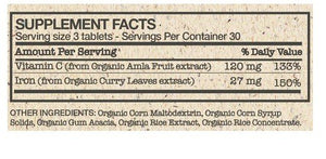 | Iron (from Organic Curry Leaves extract) | 27 mg | 150% |