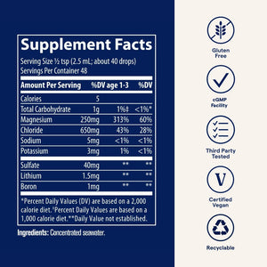 Suggested Usage: This product has a very strong taste. We recommend mixing it with juice or food and dividing the serving throughout the day to mask the concentrated mineral flavor. Do not refrigerate. Begin regimen by taking 10 drops for 3 consecutive days. Each day thereafter, increase serving by 10 drops up to teaspoon (40 drops) once or twice daily. Children age 1-3: Take 1 drop for every 5 lbs of body weight. Remineralize Water: To improve the flavor of distilled, reverse osmosis, or purified water, add 20-40 drops per gallon or to taste (2-4 drops per glass). Minor crystallization may occur, but this does not affect the quality of the product. Approved for use as an organic food additive and processing additive. For regular or sodium-restricted diets.