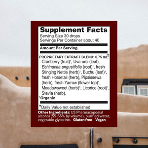 | Cranberry (fruit)*, Uva-ursi (leaf), Echinacea Angustifolia (root)*, fresh Stinging Nettle (herb)*, Buchu (leaf)*, fresh Horsetail (herb), Pipsissewa (herb), fresh Yarrow (flower top)*, Meadowsweet (herb)*, Licorice (root)*, Stevia (herb). | ||