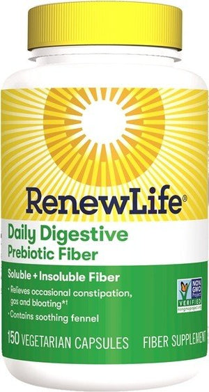 Renew Life Daily Digestive Prebiotic Fiber is made with a mix of soluble and insoluble fiber and contains soothing fennel.* It comes in convenient vegetarian capsules for use at home or on the go.