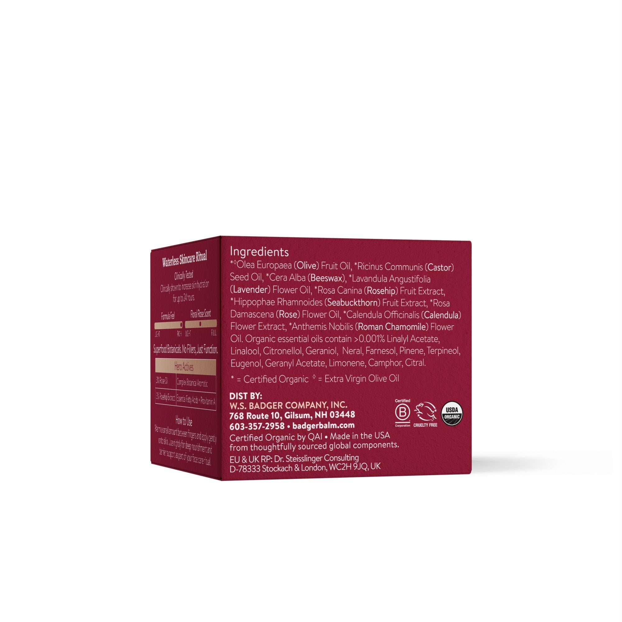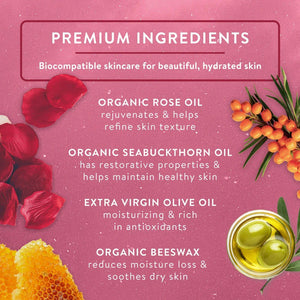 Other Ingredients:Organic Extra Virgin Olive Oil, Organic Castor Oil, Organic Beeswax, Organic Lavender Oil, Organic Rosehip Extract, Organic Seabuckthorn Extract, Organic Rose Oil, Organic Calendula Extract & Organic Roman Chamomile Oil.