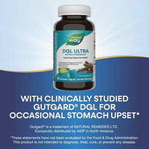 DGL is short for deglycyrrhizinated licorice extract, which is a major mouthful to say hence the acronym! Licorice root has been used for a variety of wellness practices and purposes throughout history, including as a digestive aid.* Natures Way DGL Ultra contains GutGard DGL licorice root for extra strength soothing digestive relief.* These convenient chewables provide you with more potent digestive relief when you need it most.*
