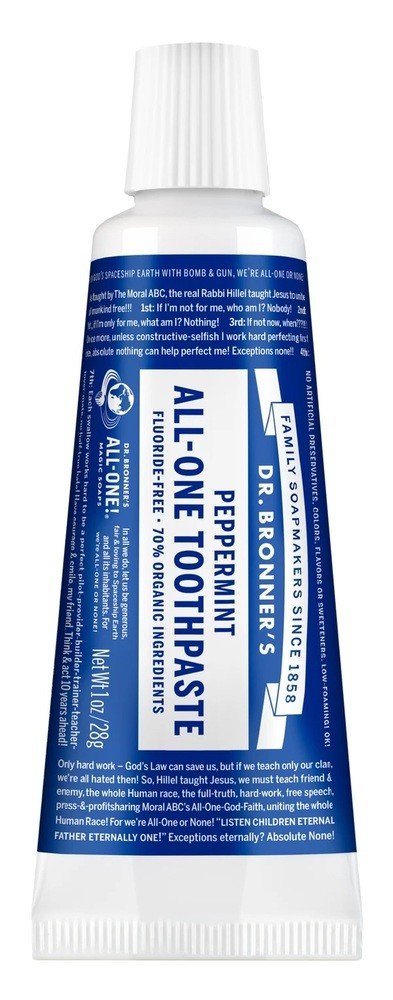Dr. Bronners All-One Toothpaste with 70% organic ingredients Our low-foaming formula has no synthetic detergent foaming agents, is fluoride-free, vegan and cruelty-free, with no artificial colors, flavors, preservatives, or sweeteners none This simple yet effective toothpaste stimulates mouth, teeth, gums and tongue, leaving them fresh and clean. Made in a 100% recyclable box and tube.
