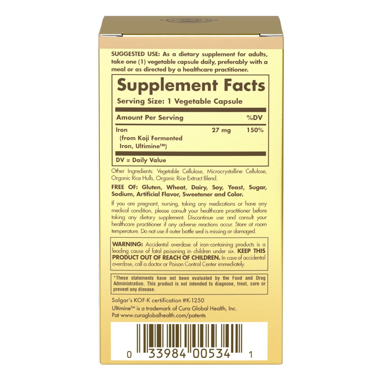 Warnings:Keep out of reach of children. As with all dietary supplements, consult your healthcare professional before use. See product label for more information. If you are pregnant, nursing, taking any medications or have any medical condition, please consult your healthcare practitioner before taking any dietary supplement. Discontinue use and consult your healthcare practitioner if any adverse reactions occur. Store at room temperature. Do not use if outer bottle seal is missing or damaged. Accidental overdose of iron-containing products is a leading cause of fatal poisoning in children under six. KEEP THIS PRODUCT OUT OF REACH OF CHILDREN. In case of accidental overdose, call a doctor or Poison Control Center immediately.