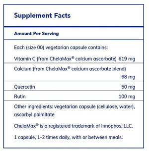 Essential-C & flavonoids offers a blend of ChelaMax vitamin C and flavonoid compounds to provide vitamin C support for healthy immune and cellular function as well as blood vessel integrity. ChelaMax offers scientifically-formulated, rigorously tested, and fully-chelated calcium ascorbate. The process of chelation wraps this non-acidic water-soluble nutrient in a protective shell to enhance bioavailability. A unique three step quality assurance and verification process ensures full chelation, purity, and efficacy. This process includes X-Ray diffraction (XRD) to confirm the actual structure of the compound, Fourier Transform Infrared (FT-IR) spectroscopy that creates a unique fingerprint specific to this material, and Thermogravimetric analysis (TGA) to confirm purity. The bioflavonoids quercetin and rutin are free radical scavengers that complement the roles of vitamin C. Quercetin helps maintain healthy mast cell function and moderate healthy leukotriene and prostaglandin metabolism. Rutin provides important support for blood vessel integrity and healthy cell function.