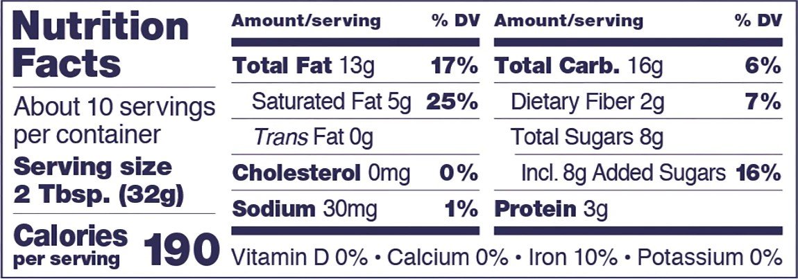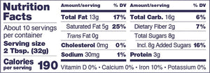 | Serving Size: About 10 servings per container | Servings Per Container: Serving size 2 Tbsp. (32 g) |