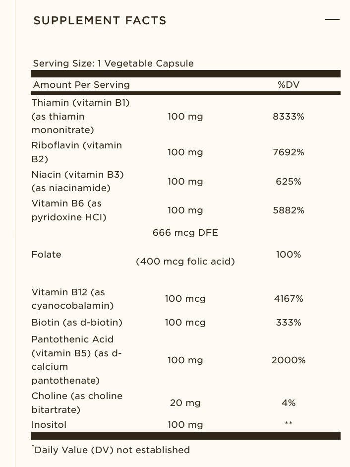 Solgar B-Complex 100 formula contains all the members of the Vitamin B family. Your body needs these vitamins to turn carbohydrates, fats and proteins into energy.
