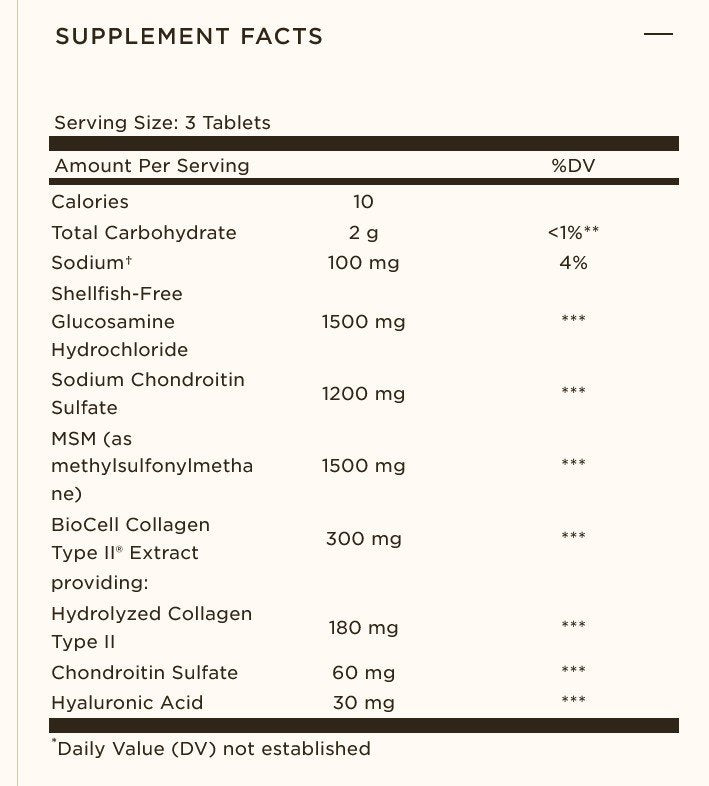 Glucosamine supports mobility, range of motion and flexibility.* It helps ease occasional joint stress due to exercise or physical activity.* Chondroitin supports cartilage and joint function.* MSM (Methylsulfonylmethane) provides a natural, bioavailable source of sulfur and promotes joint comfort.* MSM works synergistically to support the benefits of glucosamine and chondroitin.* This formulation also provides Hyaluronic Acid.