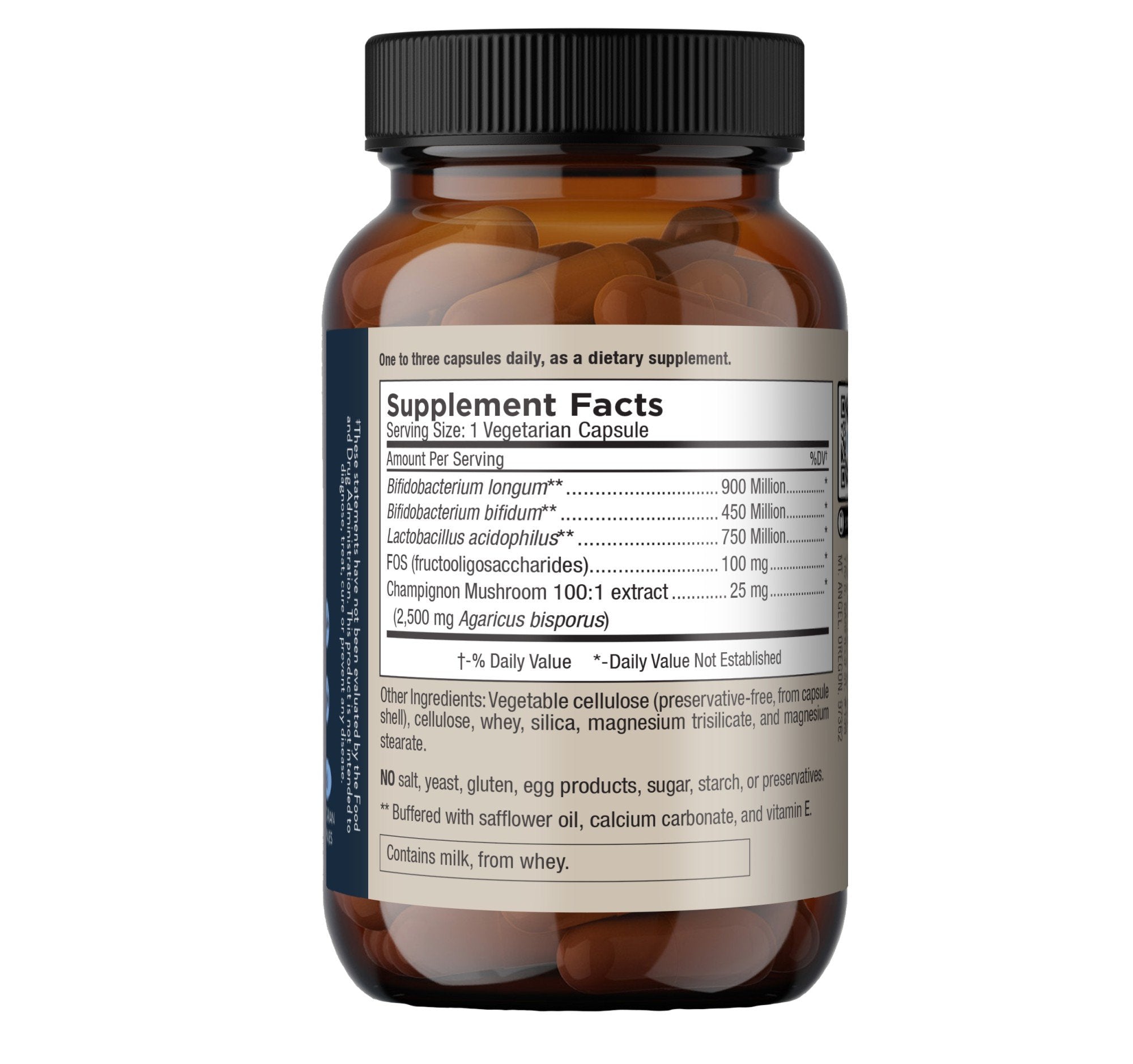 Other Ingredients:Vegetable cellulose (preservative-free, from capsule shell), cellulose, whey (from milk), silica, magnesium trisilicate, and magnesium stearate. Contains milk, from whey.