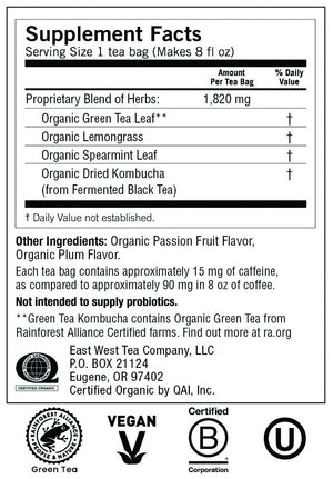 Organic Green Tea Leaf**, Organic Lemongrass, Organic Spearmint Leaf, Organic Passion Fruit Flavor, Organic Plum Flavor, Organic Dried Kombucha (from Fermented Black Tea). **Green Tea Kombucha contains Organic Green Tea from Rainforest Alliance Certified farms. Find out more at ra.org, Not Intended to supply probiotics.