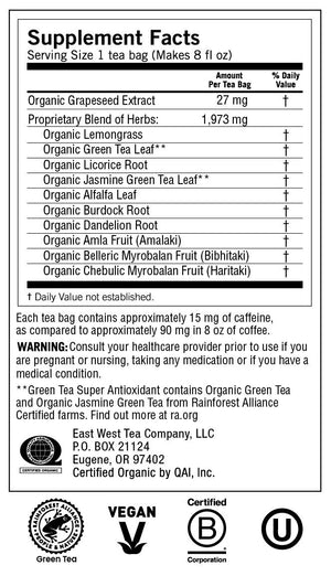 Yogi Green Tea Super Antioxidant tea is purposefully formulated to supply antioxidants and support overall health. We combine our select blend of Green Tea with Grapeseed Extract, which supplies naturally potent antioxidants. Lemongrass adds bright citrus flavor, while Licorice and Jasmine Green Tea lend sweet and floral notes. Rejuvenate with a fragrant cup of Yogi Green Tea Super Antioxidant tea.*