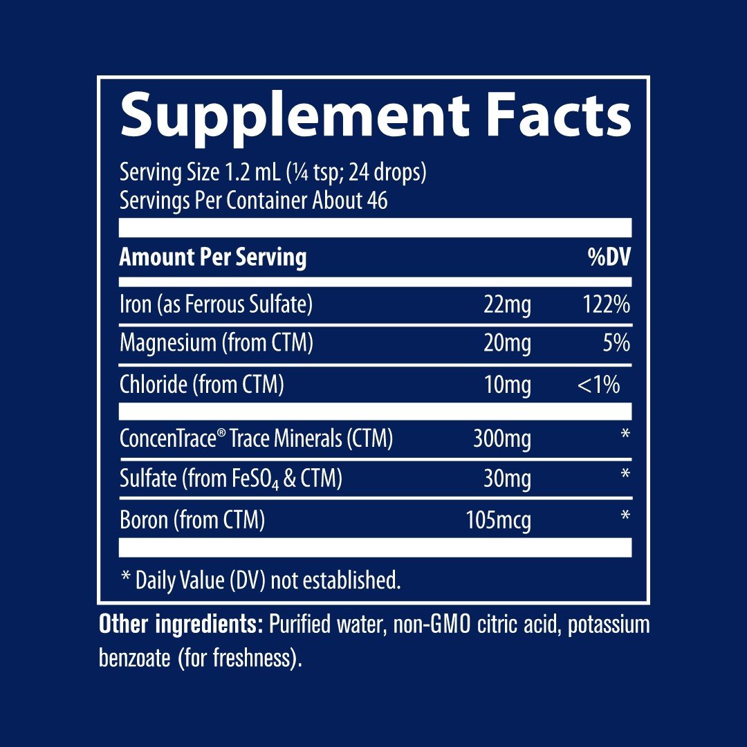 Ionic Iron is a rich, concentrated liquid dietary supplement that provides iron in an ionic, bioavailable form. Iron plays an important role in proper enzyme and cognitive function, energy production, and optimal immune system maintenance.