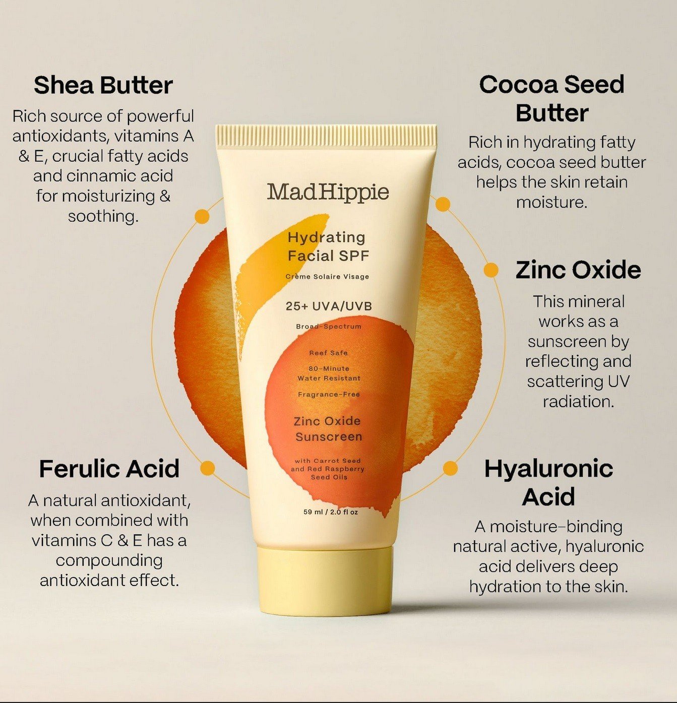 A clear, clean mineral SPF 25+ w/ 80-min water resistance loaded with actives to keep your skin protected, hydrated, and healthy! Our lotion blends in beautifully, and is perfect for daily use around town, a jog, or a trip to the beach!