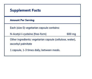 N-Acetyl-l-Cysteine (NAC) is a derivative of the dietary amino acid l-cysteine. NAC has a high affinity for lung tissue, which it supports through mucolytic and antioxidant action. By disrupting disulfide bonds, NAC thins mucus. It is a powerful free radical scavenger and thus supports the body's natural defense system. NAC supports tissue levels of glutathione, a key component of the antioxidant defense system. It also has the ability to help chelate heavy metals.