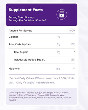 Warnings:Keep out of reach of children. See product label for more information. This product is not intended to treat insomnia or other sleep disorder. Consult a physician before using this product if under the age of 18, taking medication, have any medical condition, are pregnant or lactating, have an autoimmune condition or depressive disorder. For ages 4 years and older. Melatonin may cause drowsiness or sleepiness, do not take when driving or operating heavy machinery, or consuming alcohol. If adverse reactions occur, discontinue use. For occasional short-term use only. Use only as directed and do not exceed suggested dose. This product should never substitute healthy sleep practices.