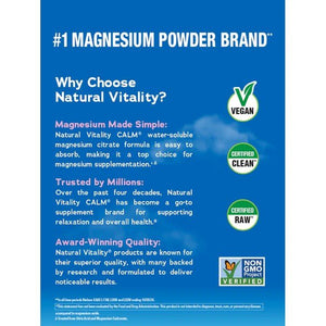 Other Ingredients:Natural Vitality CALM is a highly absorbable proprietary formulation of pH-balanced Magnesium Citrate in ionic form (created from Citric Acid and Magnesium Carbonate), Organic Flavor, Organic Stevia (leaf) Extract.