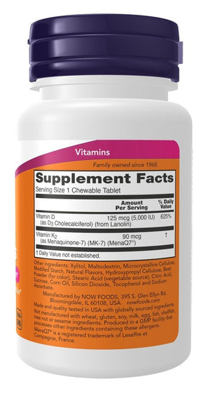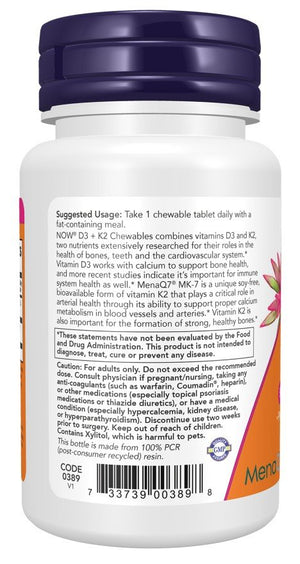 NOW D3 + K2 Chewables combines vitamins D3 and K2, two nutrients extensively researched for their roles in the health of bones, teeth and the cardiovascular system.* Vitamin D3 works with calcium to support bone health, and more recent studies indicate its important for immune system health as well.* MenaQ7 MK-7 is a unique soy-free, bioavailable form of vitamin K2 that plays a critical role in arterial health through its ability to support proper calcium metabolism in blood vessels and arteries.* Vitamin K2 is also important for the formation of strong, healthy bones.*