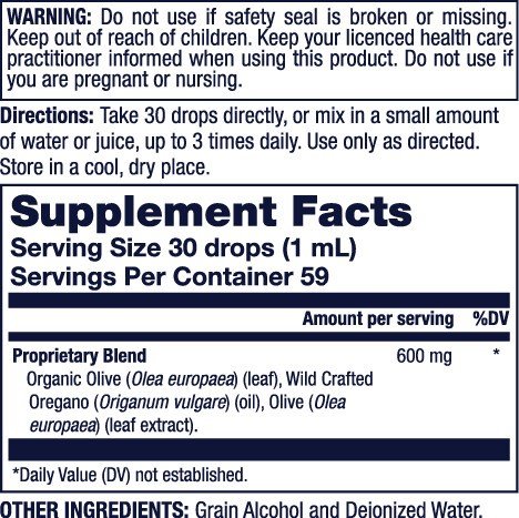 | Proprietary Blend: Organic Olive Leaf (Olea europea)(leaf), Wild Crafterd Oregano(Origanum vulgare) (oil), Olive (Olea europaea) (leaf extract) | 600 mg | * |