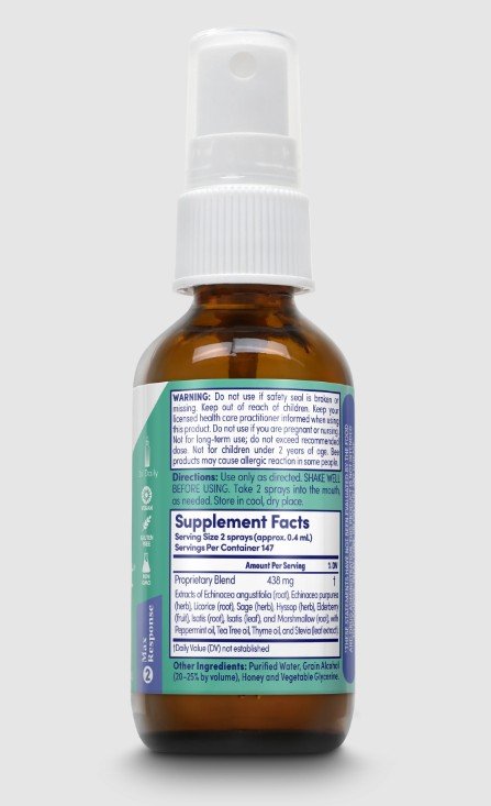 | Extracts of Echinacea angustifolia (root), Echinacea Purpurea (herb), Licorice (root), Sage (herb), Hyssop (herb), Elderberry (fruit), Isatis (leaf), and Marshmallow (root), with Peppermint oil, Tea Tree oil, Thyme oil, and Stevia (leaf extract). | ||