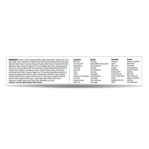 Other Ingredients:phtyoplenolin bio-chelated extracts of calendula flowers, chamomile flowers, echinacea tops, gotu kola whole herb, prickly ash bark, olive leaf, grapefruit seed, black walnut green hulls, green tea leaf, essential oils of peppermint, oregano, lavender, clove, eucalyptus & thyme, cinnamon *** bark, bio-saponins yucca spp, quillaia (quillaia saponaria) bark, sarsaparilla root, wild yam root, folic acid, co-enzyme q10, sodium bicarbonate, xanthan gum,, chlorophyll, l-lysines, xylitol, aloe vera. Base Ingredients vegetable glycerin, purified water, calcium carbonate, silica.