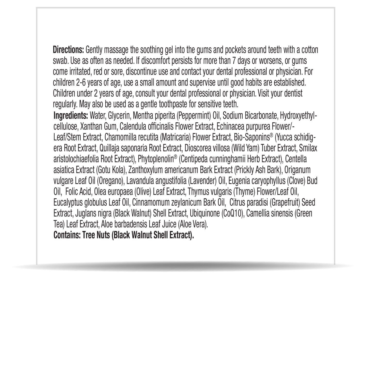 Suggested Usage: Gently massage the soothing gel into the gums and pockets around teeth with a cotton swab. Use as often as needed. If discomfort persists for more than 7 days or worsens, or gums become irritated, red or sore, discontinue use and contact your dental professional or physician. For children 2-6 years of age, use a small amount and supervise until good habits are established. Children under 2 years of age, consult your dental professional or physician. Visit your dentist regularly.