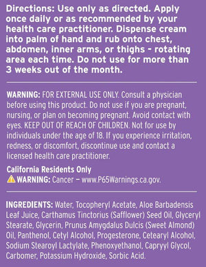 Suggested Usage: Apply once or twice daily by dispensing 1/4 to 1/2 teaspoon into your palm and rubbing cream onto the skin of your chest, abdomen, inner arms or thighs, rotating area each time. For best results, use three weeks on and one week off each month.