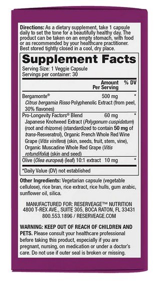 | Pro-Longevity Factors Blend Wildcrafted Japanese Knotweed Extract (Polygonum cuspidatum) (root and rhizome) (standardized to contain 50mg of trans-Resveratrol), Organic French Red Whole Wine Grapes (Vitis vinifera) (skin, seeds, fruit, stem, vine), USDA certified Organic Muscadine Whole Red Grape (Vitis rotundifolia) (skin and seed) | 100 mg | ** |