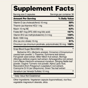 | Berberine HCL (Berberis aristata), Cinnamon (Cinnamomum cassia) bark powder, L-Theanine, Gymnema leaf extract, Fenugreek seed extract, Bitter Melon fruit extract, Moringa (Moringa oleifera) organic leaf extract, Ashwagandha root extract, Lion's Mane (Hericium erinaceius) mycelium, Stinging Nettle leaf powder, Organic Turmeric root powder, Alpha Lipoic Acid, Resveratrol (from Polygonum cuspidatum root extract), Coenzyme Q-10 (as Ubiquinone), Green Tea leaf extract | ||