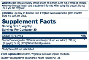 | Shoden Ashwagandha (Withania somnifera) (root and leaf extract) (Supplying 84 mg 35% Withanolide Glycosides) | 240 mg | * |