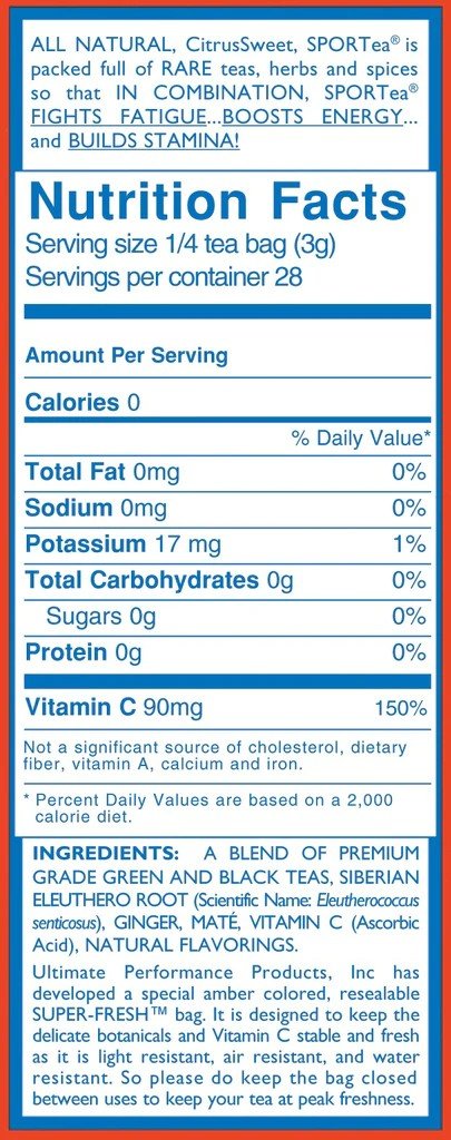 | Not a significant source od cholesterol,dietary fiber,vitamin A,calcium and ironA blend of premium grade green and black teas,siberiam eleuthero root (scientific name: Eleutherococcus senticosis),ginger,mate,vitamin c (ascorbic acid),natural flavorings. | ||
