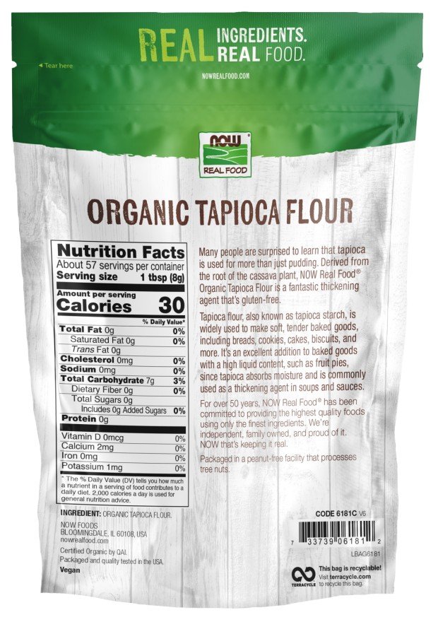 Many people are surprised to learn that tapioca is used for more than just pudding. Derived from the root of the cassava plant, NOW Real Food Organic Tapioca Flour is a fantastic thickening agent that's gluten-free. Tapioca flour is widely used to make soft, tender baked goods, including breads, cookies, cakes, biscuits, and more. It's an excellent addition to baked goods with a high liquid content, such as fruit pies, since tapioca absorbs moisture and is commonly used as a thickening agent in soups and sauces.