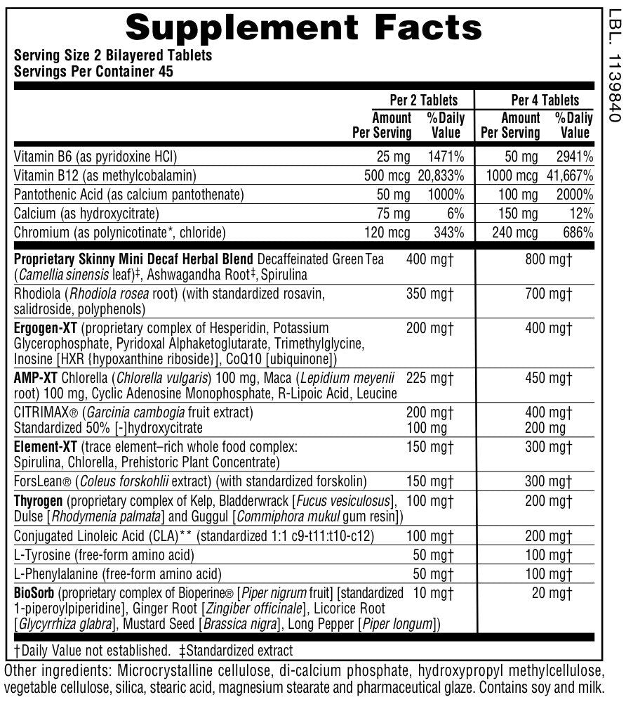 | Proprietary Skinny Mini Decaf Herbal Blend Decaffeinated Green Tea (Camellia sinensis leaf) (standardized extract), Ashwagandha Root (standardized extract), Spirulina | 400 mg | * |