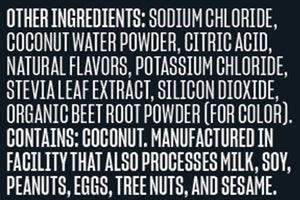 Other Ingredients:Sodium Chloride, Coconut Water Powder, Citric Acid, Natural Factors, Potassium Chloride, Stevia Leaf Extract, Silicon Dioxide, Organic Beet Root Powder (For Color). Contains Coconut. Manufactured in facility that also processed milk, soy, peanuts, eggs, tree nuts, and sesame.
