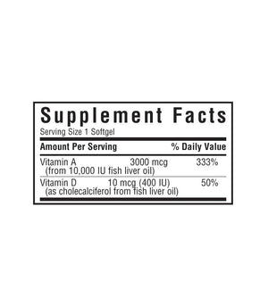 | Vitamin A (from 10,000 IU fish liver oil) | 3000 mcg | 333% |