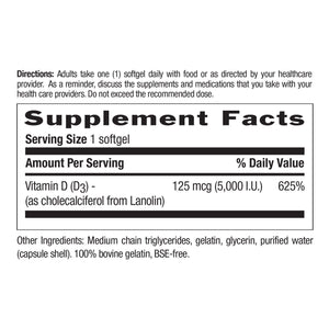 | Vitamin D3 (as Cholecalciferol From Lanolin) | 5000 IU | 1,250% |
